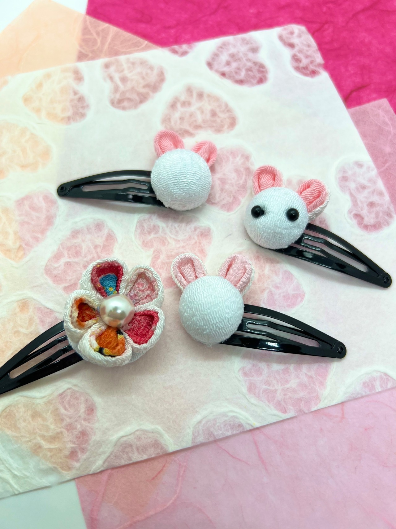 お花とうさぎちゃんヘアピン~つまみ細工~