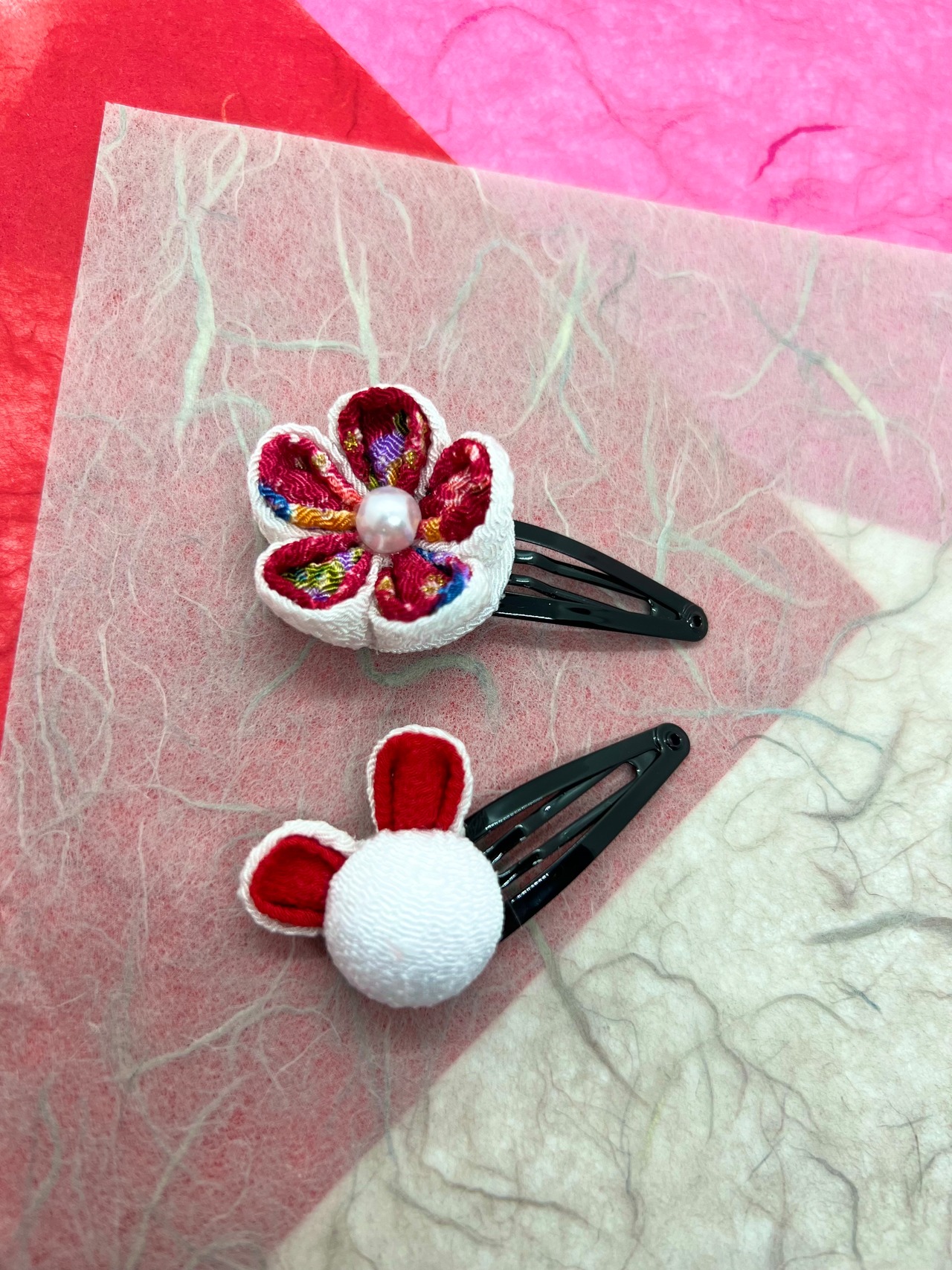 お花とうさぎちゃんヘアピン~つまみ細工~