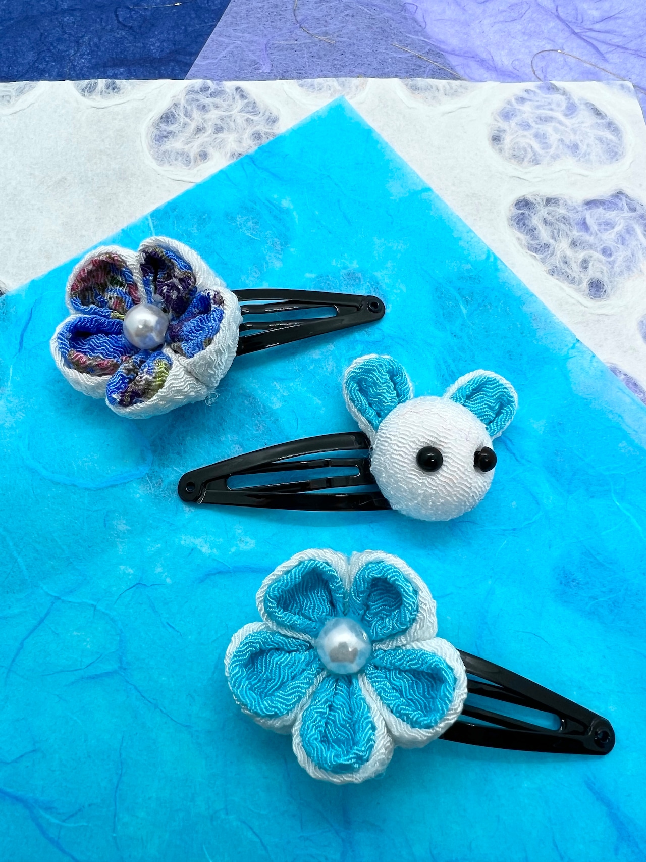 お花とうさぎちゃんヘアピン~つまみ細工〜
